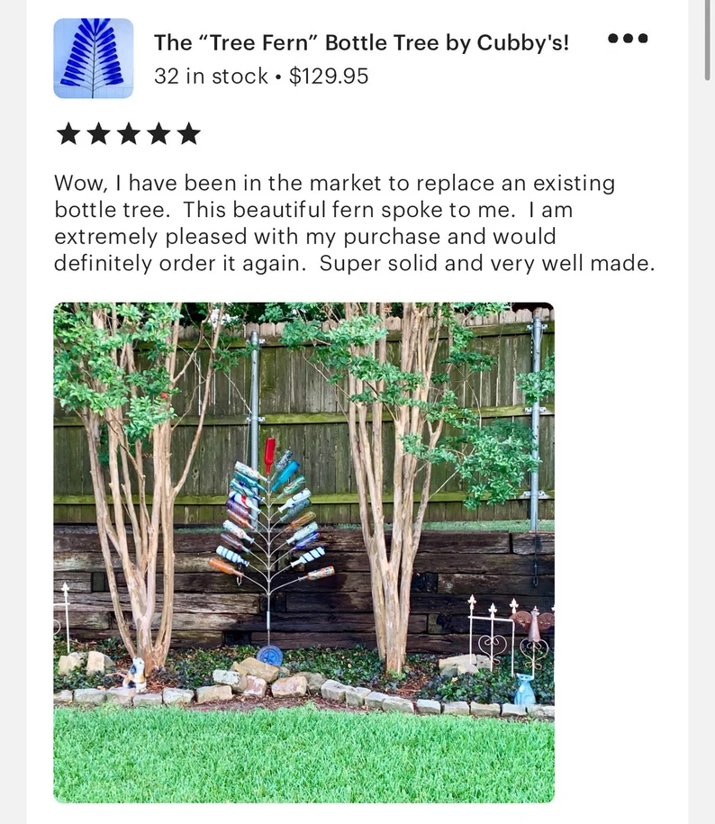 Wow, I have been in the market to replace an existing bottle tree. This beautiful fern spoke to me. I am extremely pleased with my purchase and would definitely order it again. Super solid and very well made.