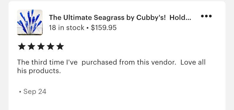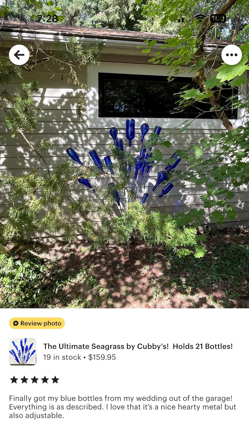 I ordered the large sea grass bottle “tree” and it was promptly delivered. I had a small issue with installation and when I reached out that afternoon, seller’s response was immediate and effective – a replacement part was delivered to the post office before close of business the same day (just before a long holiday weekend). I had the part in less than 48 hours. This bottle tree is exactly what I wanted, well constructed and a bit unusual. It is as outstanding as its maker. Don’t hesitate – if you want a bottle tree for your yard, this is the shop for it!